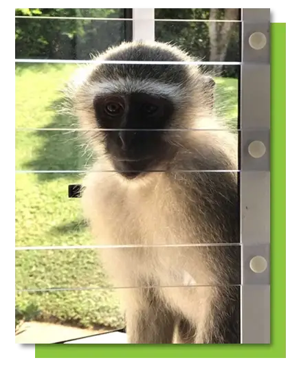 Windows can now be secured with our beautiful range of clear Primate Barriers, the perfect solution to prevent primate intrusions at bush lodges, resorts, hotels and homes.